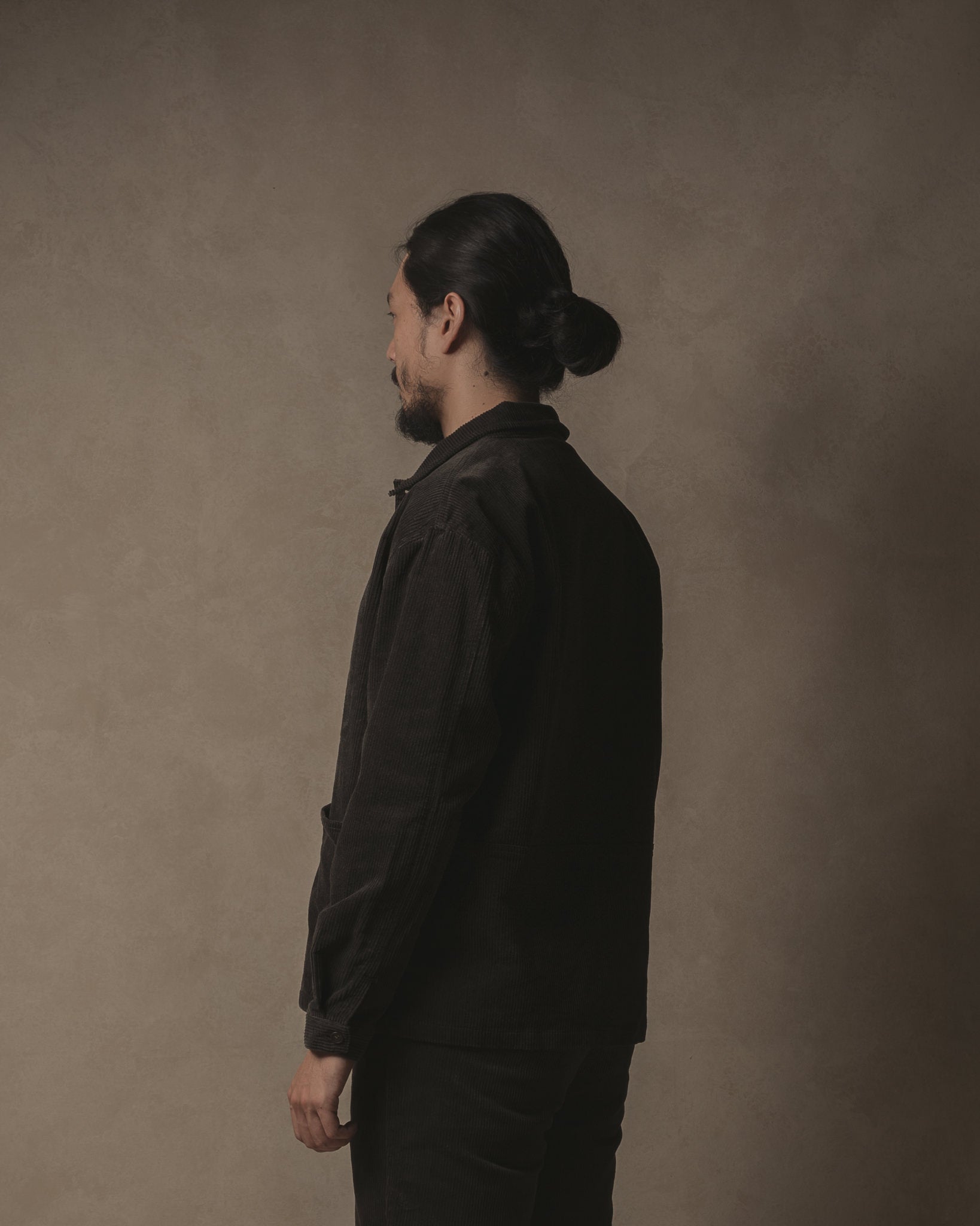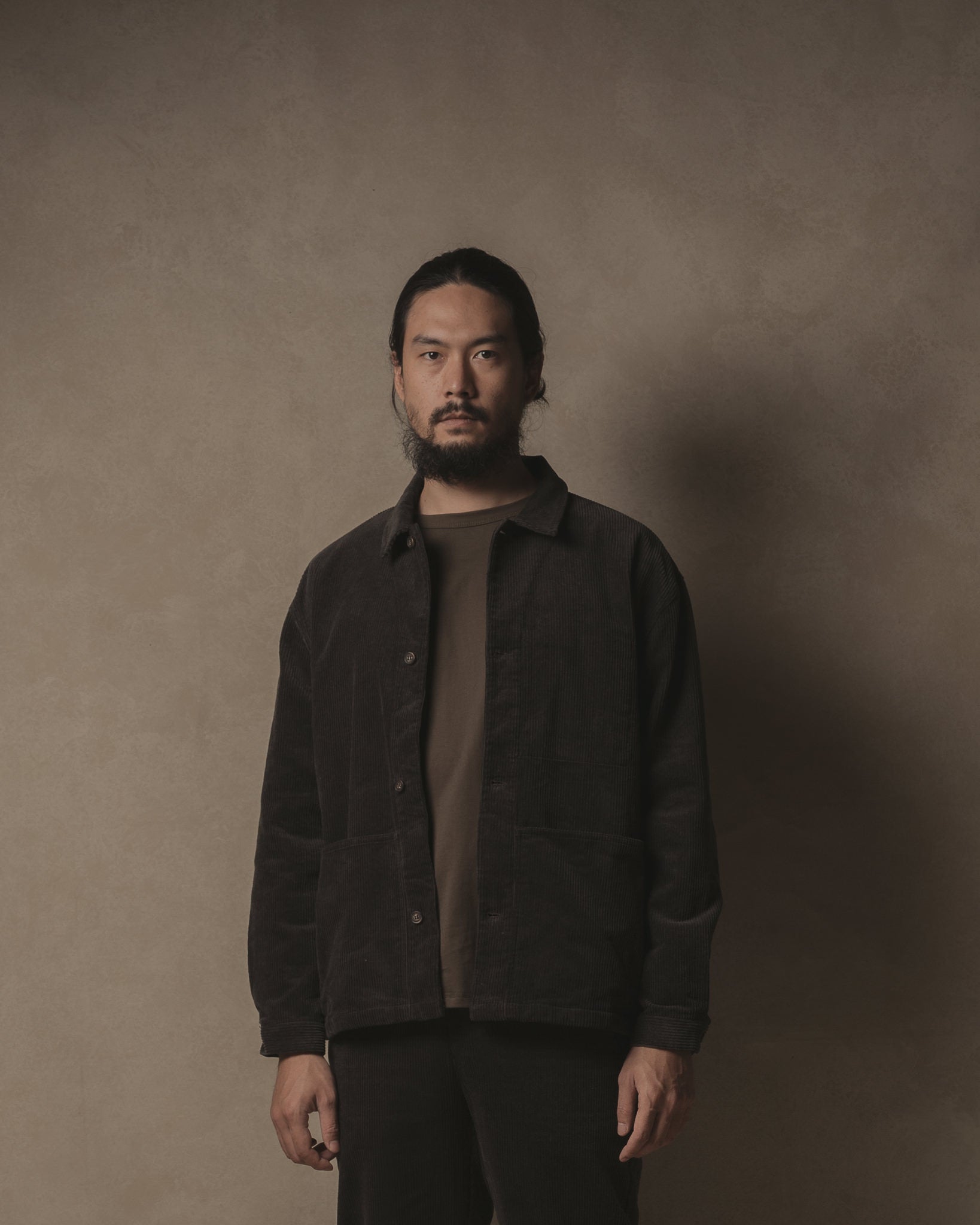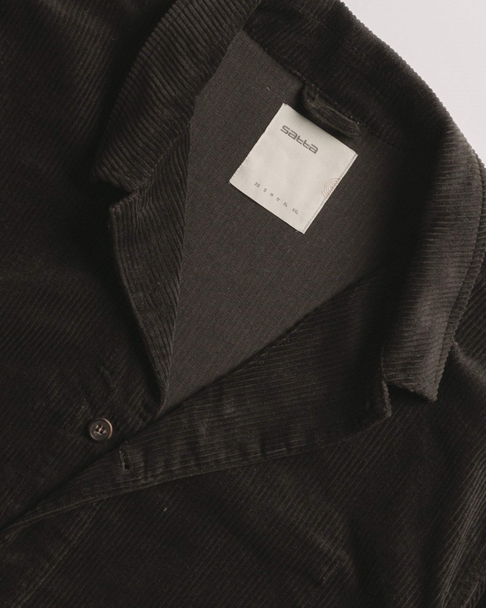 ブラック コーデュロイの Satta Allotment ジャケット。自然な柔らかさの 8 ウェール コーデュロイで作られたアロットメント ジャケットは、カジュアルでボクシーなフィット感で、2 つの大きなヒップポケットが特徴です。生地は酵素洗浄を施して柔らかさを出しています。