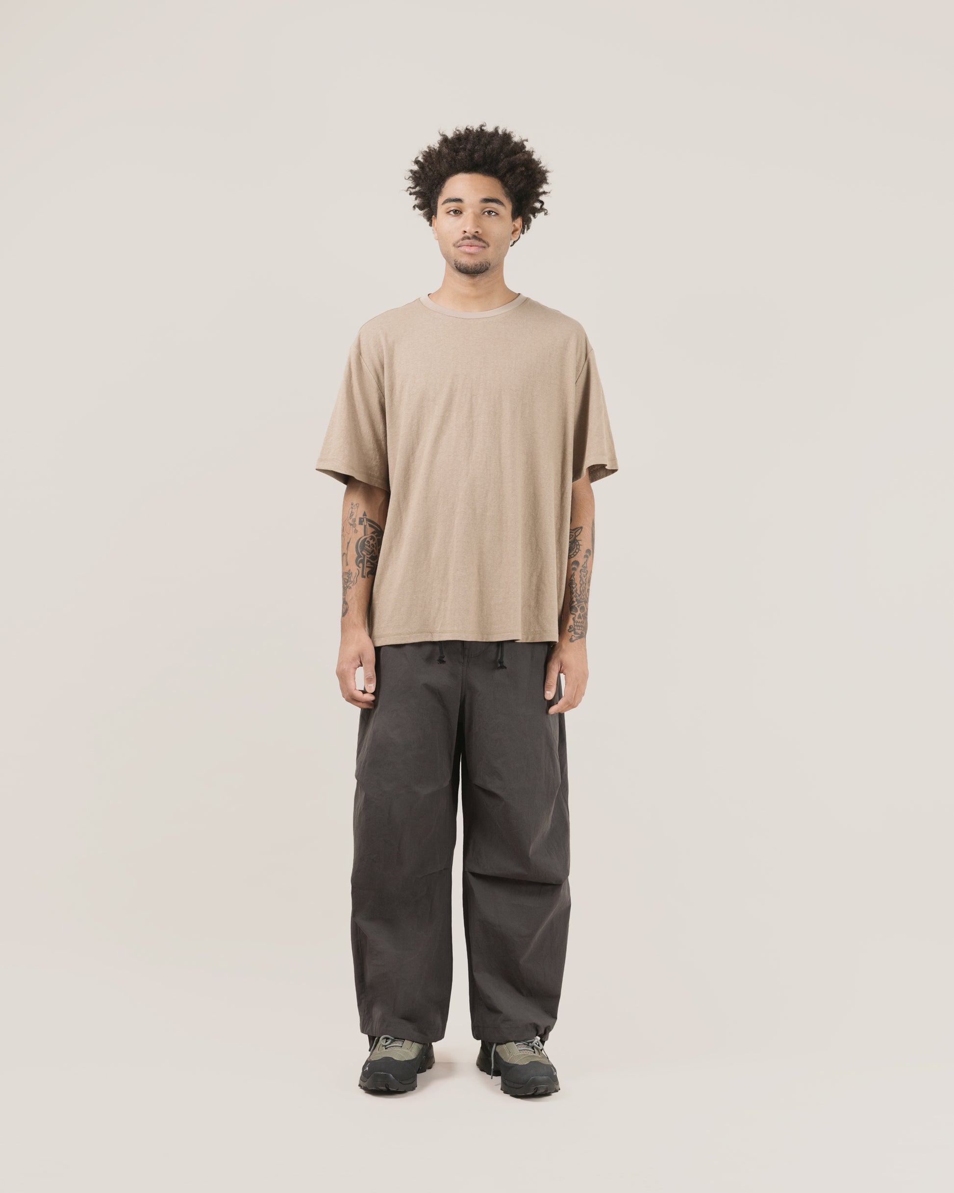 The Fold Cargo Pant is a straight wide-leg cargo pant crafted from paper touch poplin for a lightweight feel. Designed with knee pleat detail and drawcord toggle adjustable waist, it blends functionality with comfort.