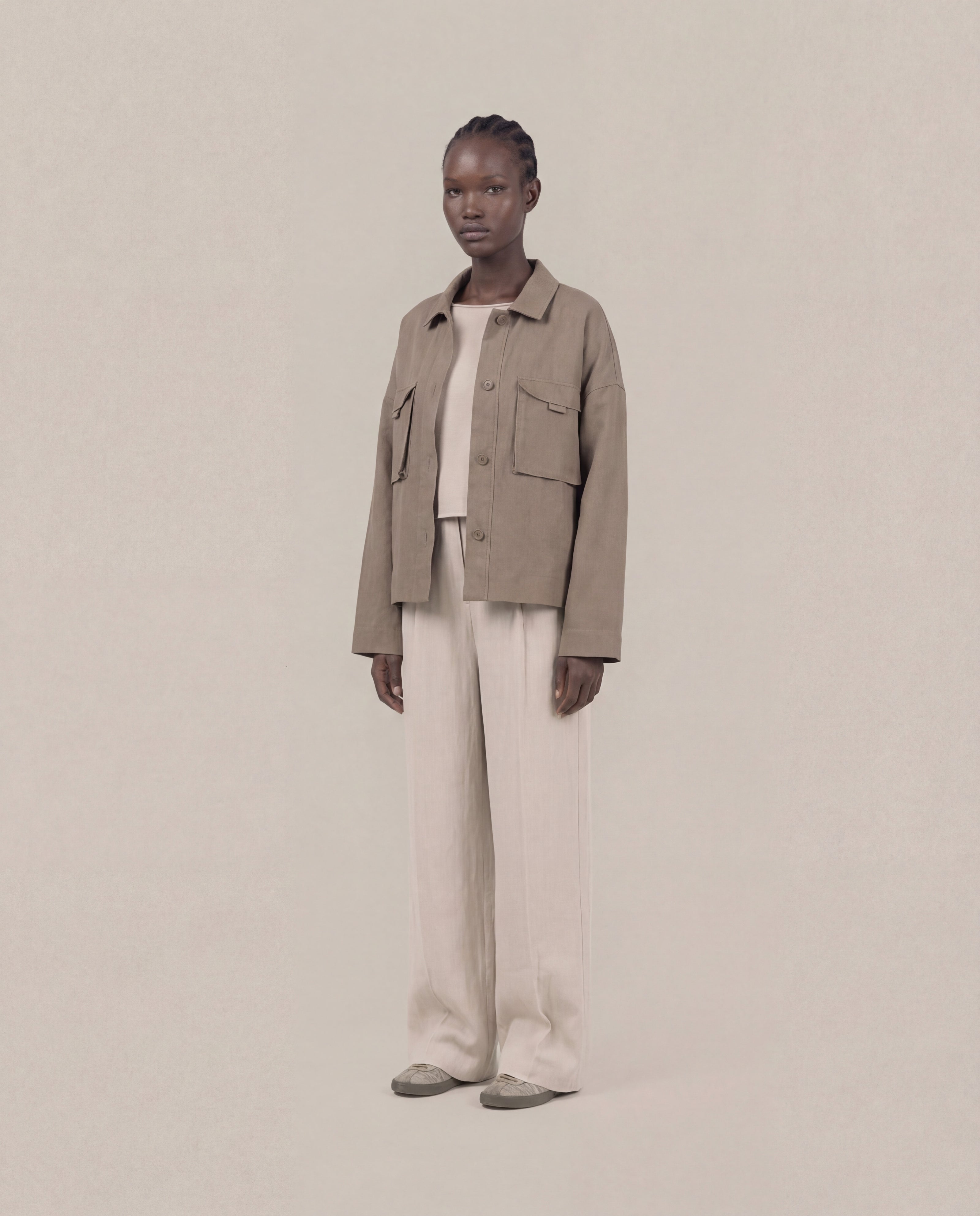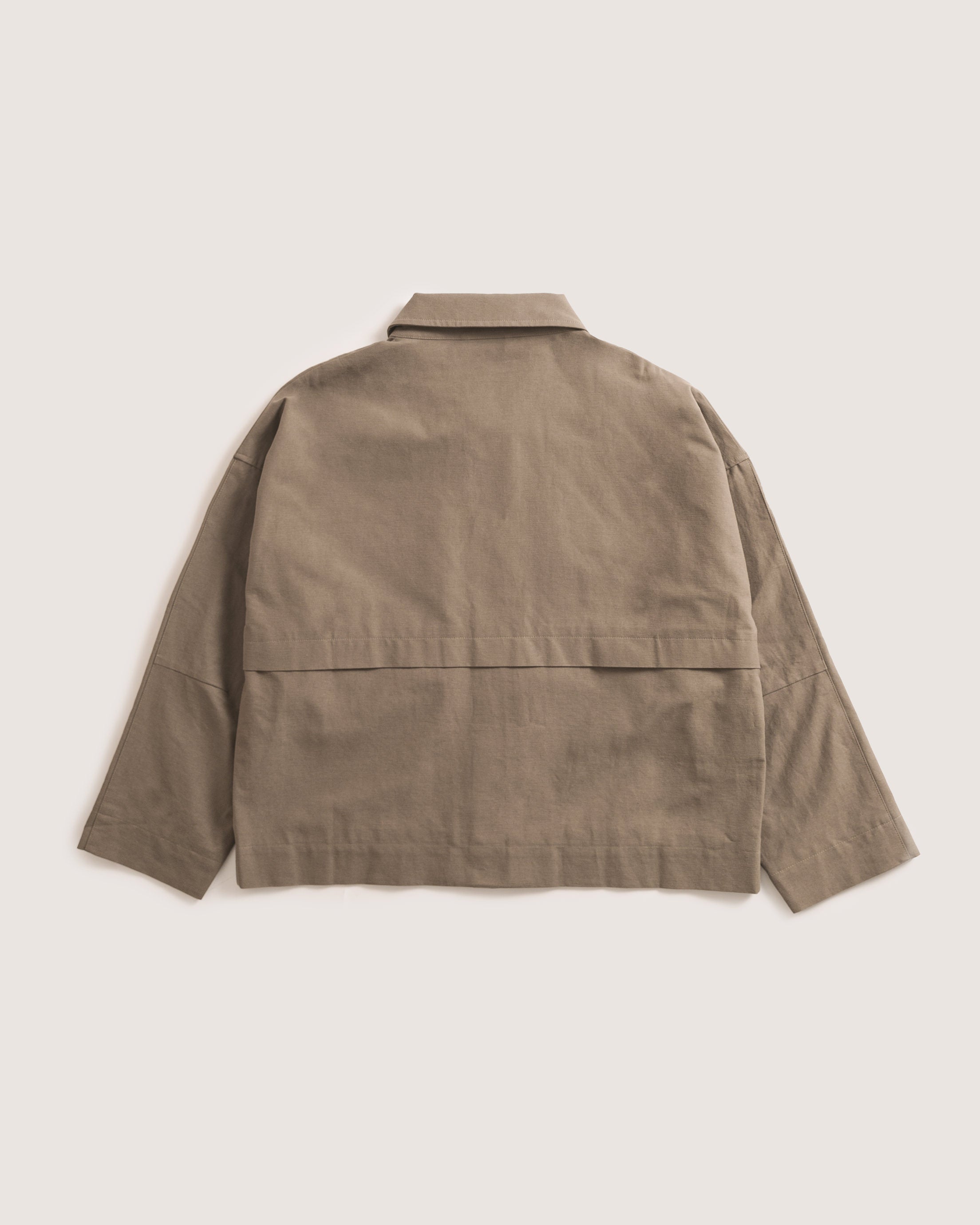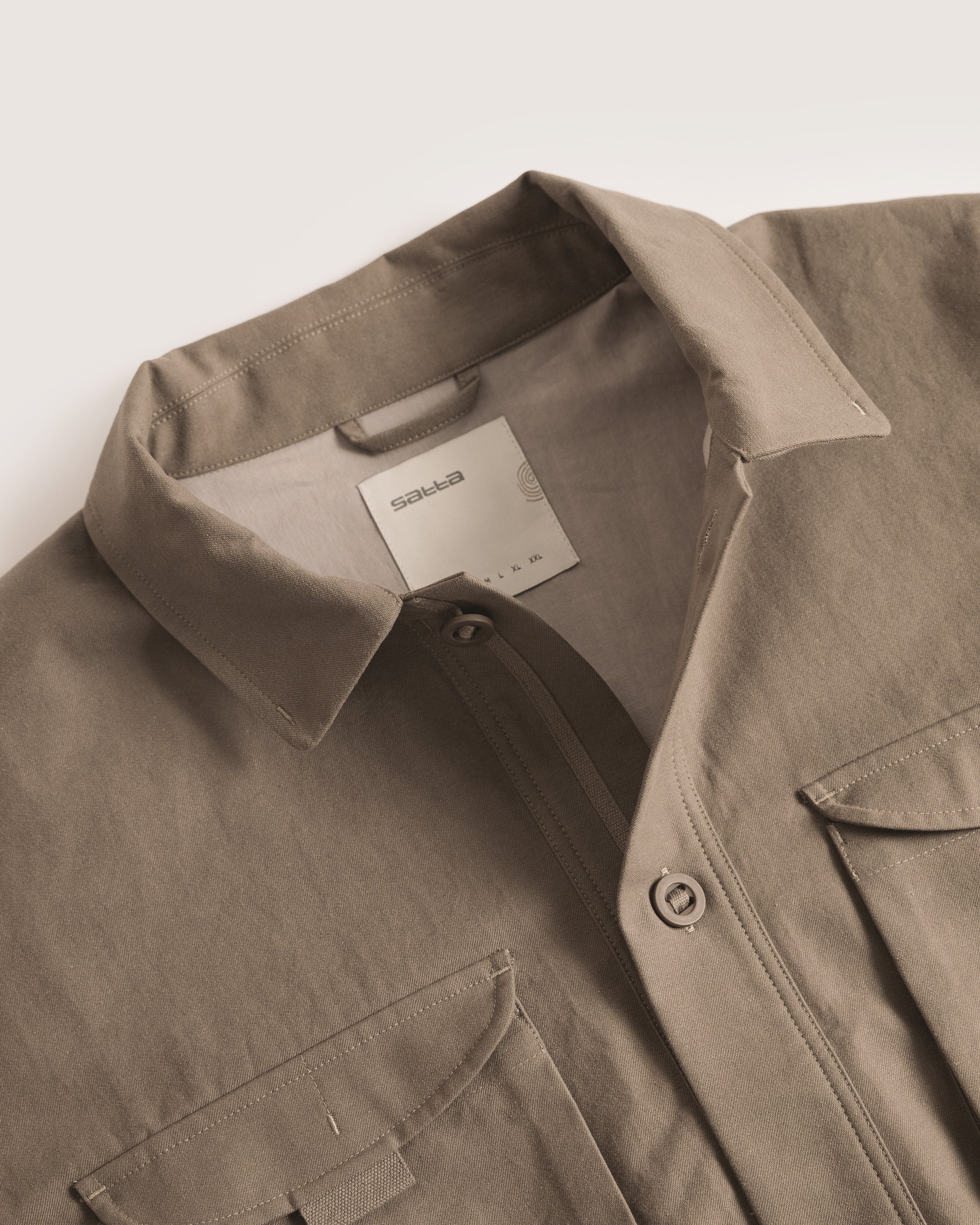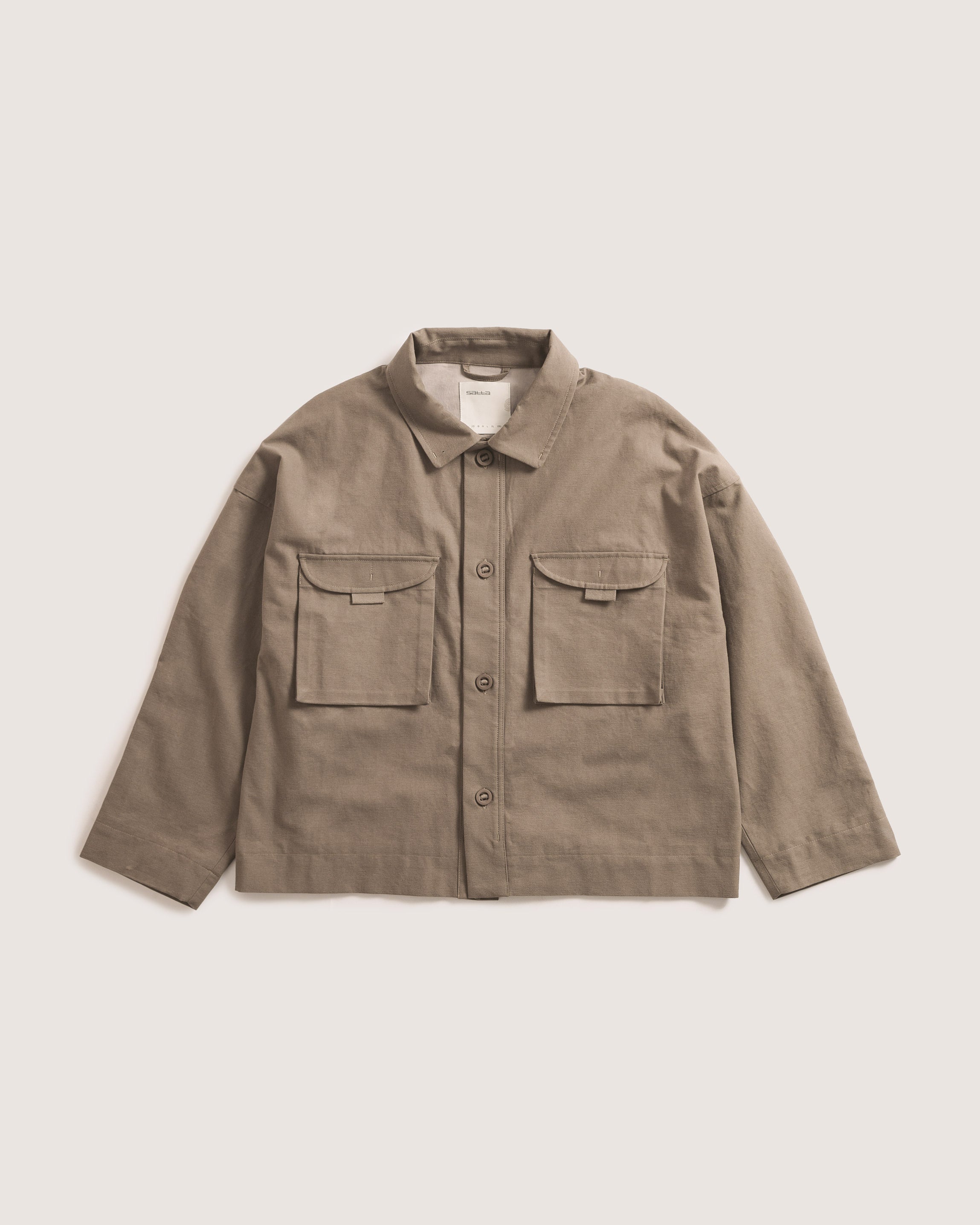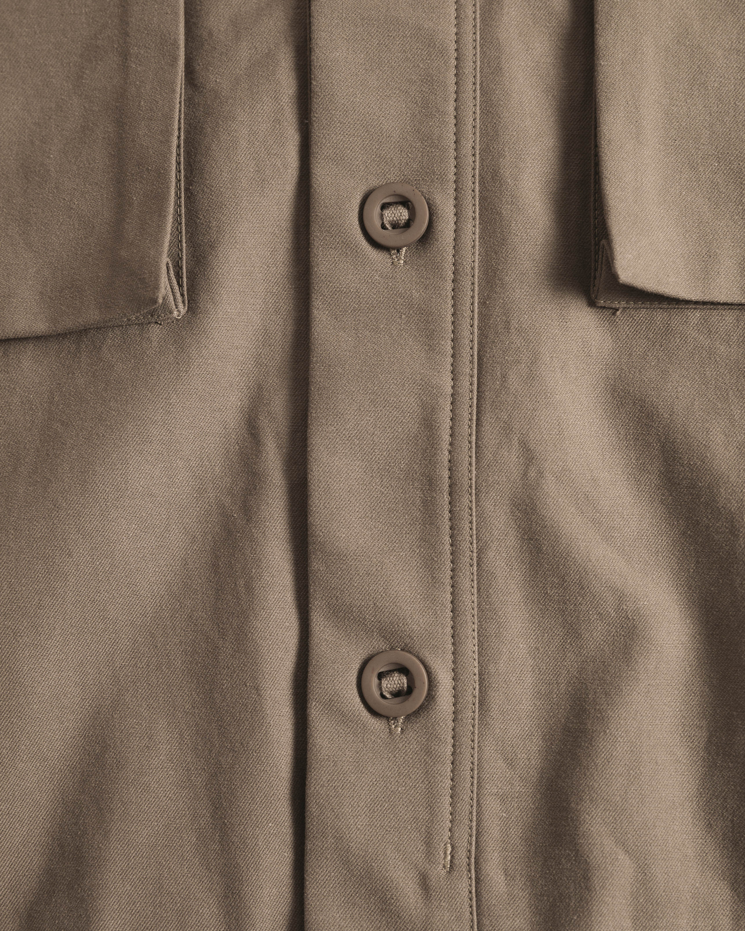 The boxy fit and oversized chest pockets, along with the distinctive tape and slot button detailing, make it a standout piece.