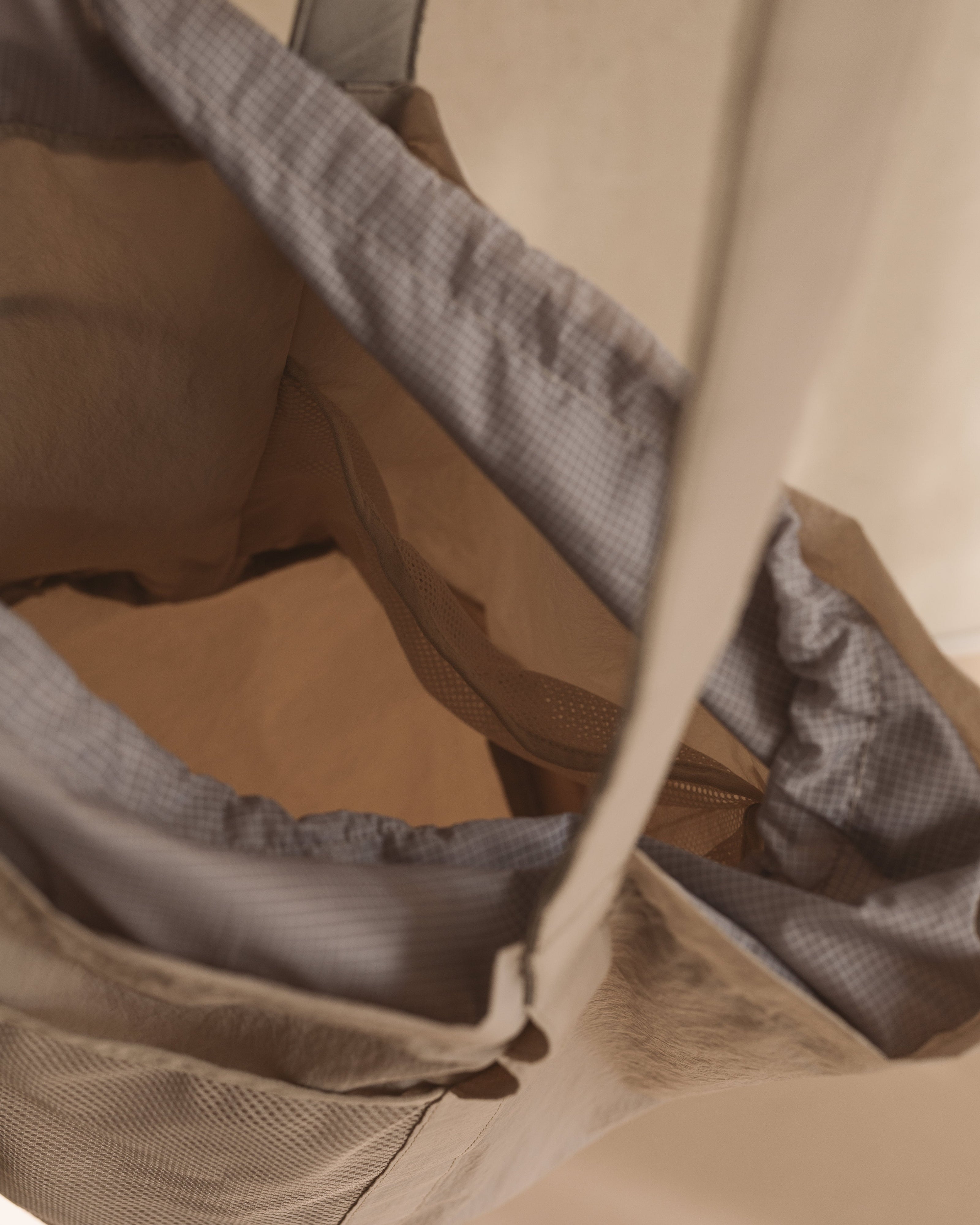 The Bubbler Bag in Oat is your ideal lightweight travel companion. Crafted with a durable nylon ripstop outer, this bag features multiple inner compartments for organized storage and a rear elasticated netting compartment for easy access. Paracord drawcord detailing adds a rugged touch to this versatile carryall.