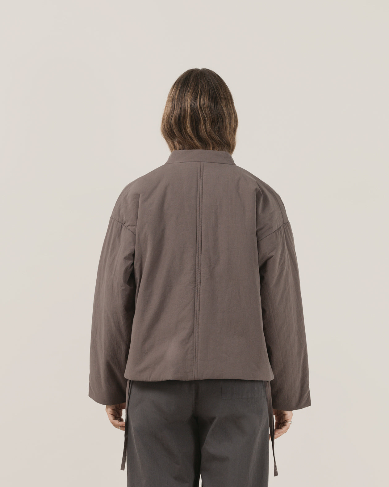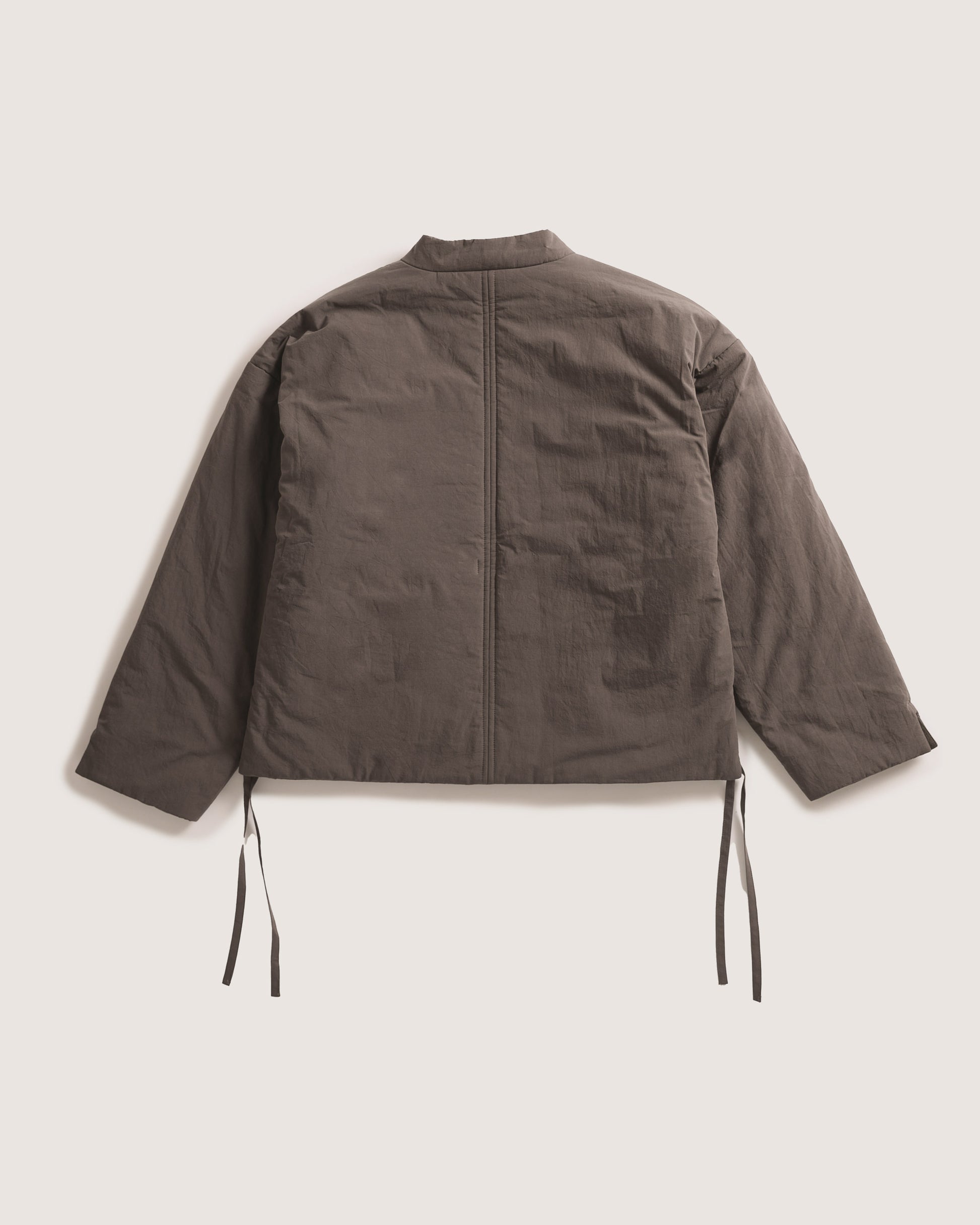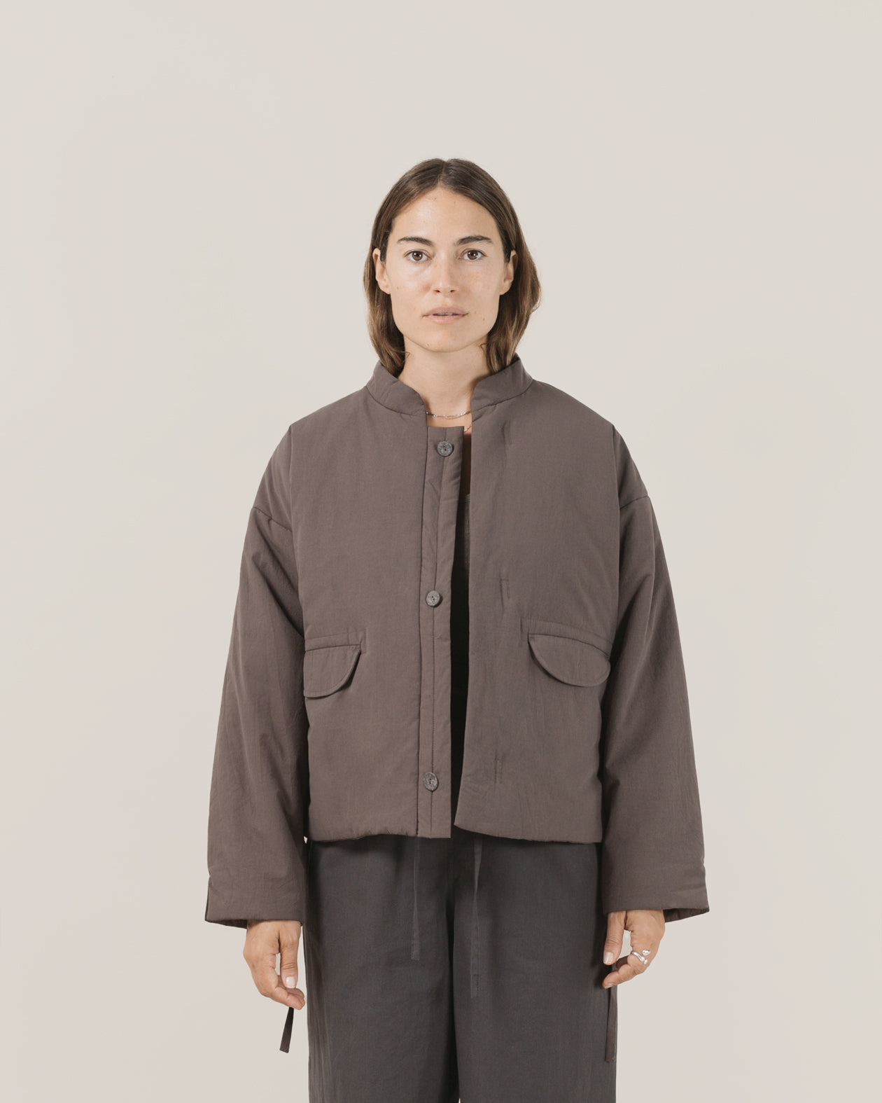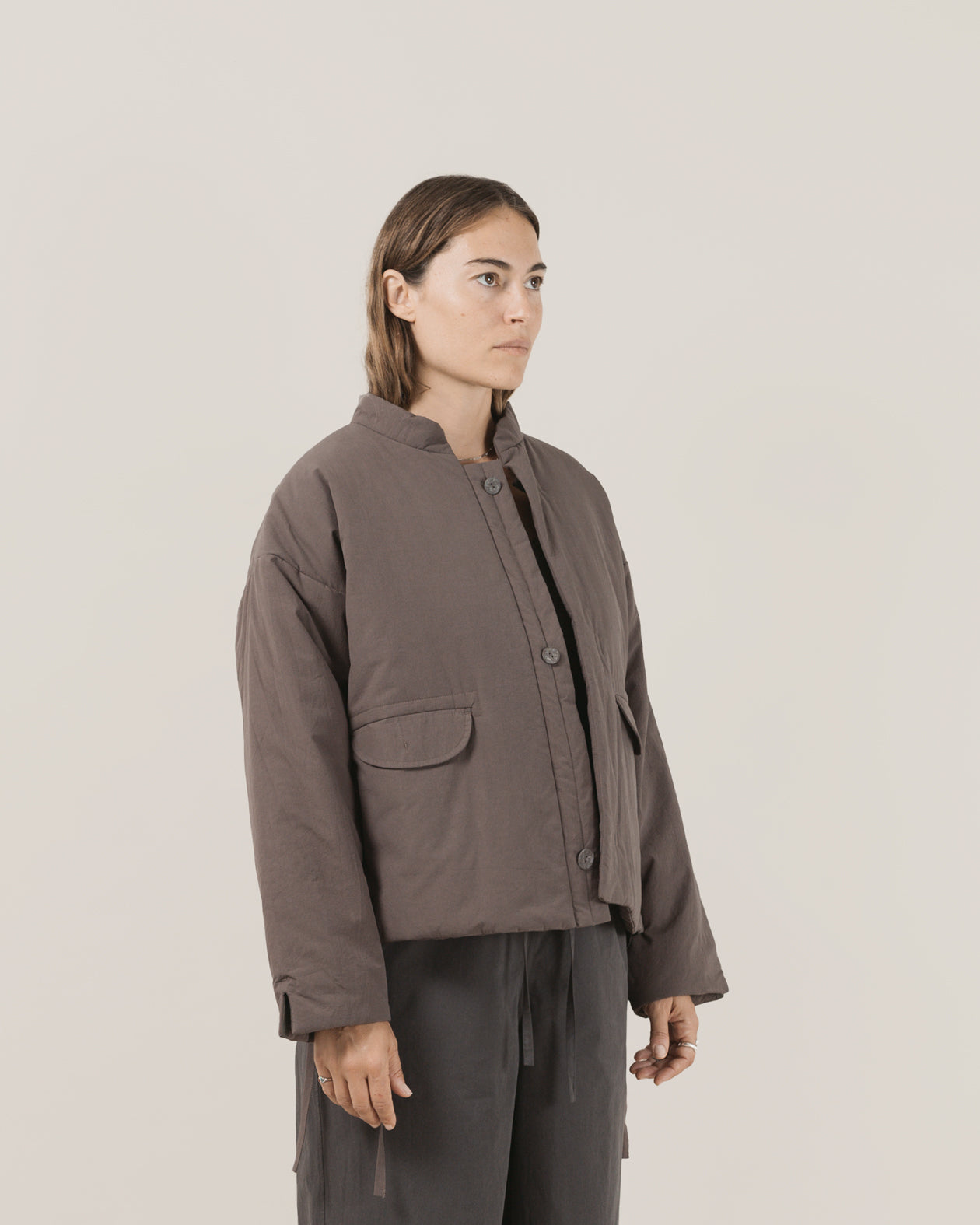 The Cropped Maha Dojo in Charcoal features peached cotton poplin outer and poly insulation for warmth. Its boxy, cropped fit is complemented by a Nehru stand collar and unique loop placket closure. Finished with semolina grain buttons and two practical hip pockets, this jacket blends structure with a contemporary silhouette.