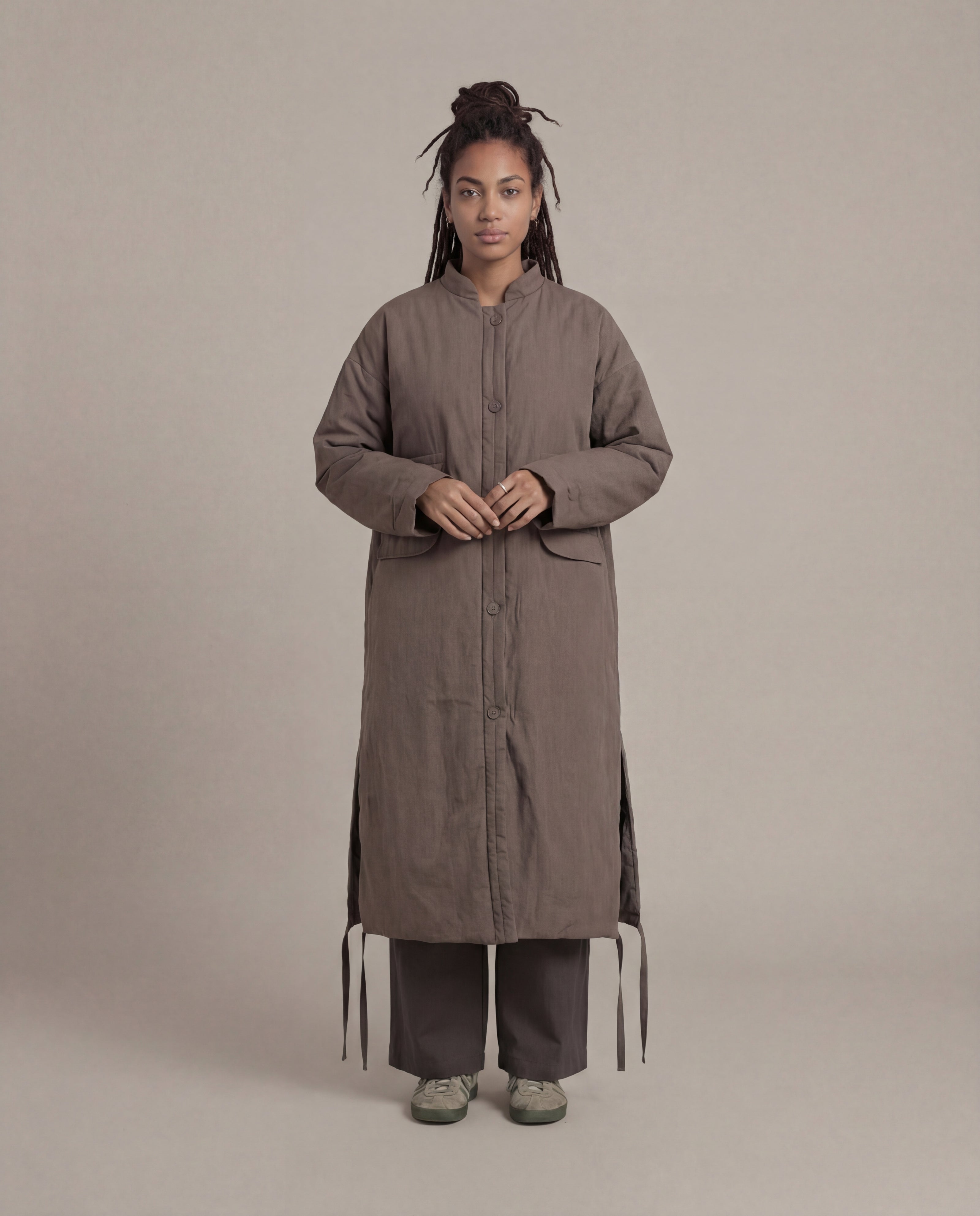 Elevate your outerwear with the Long Maha Dojo [W] in Graphite. Made from peached cotton poplin and insulated with poly filling, this coat combines warmth and style. It features a loop placket closure, semolina grain buttons, and deep curve side splits at the hem with subtle tape detailing. The two hip pockets add practical convenience to this elegant design.